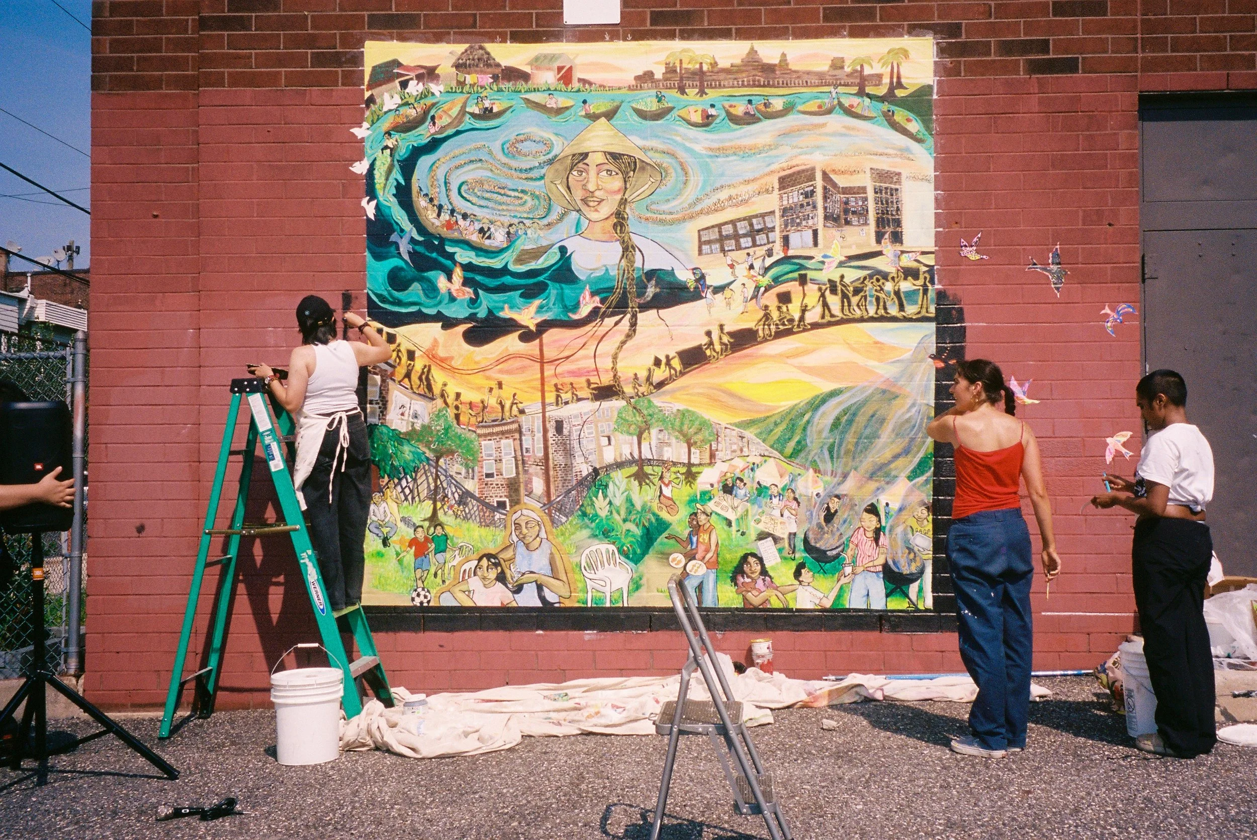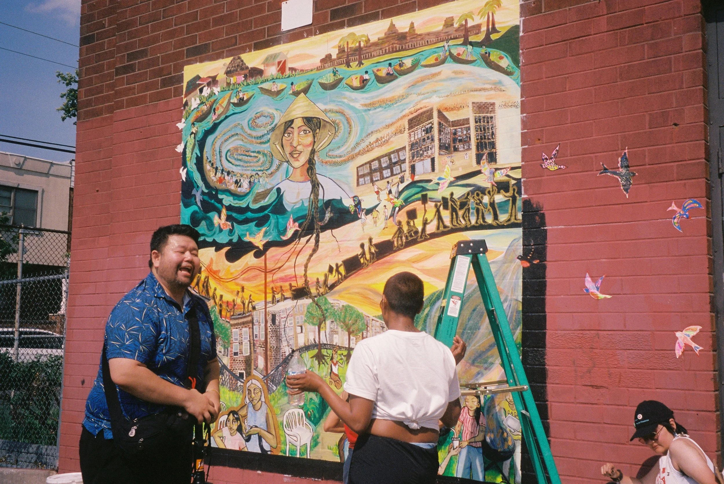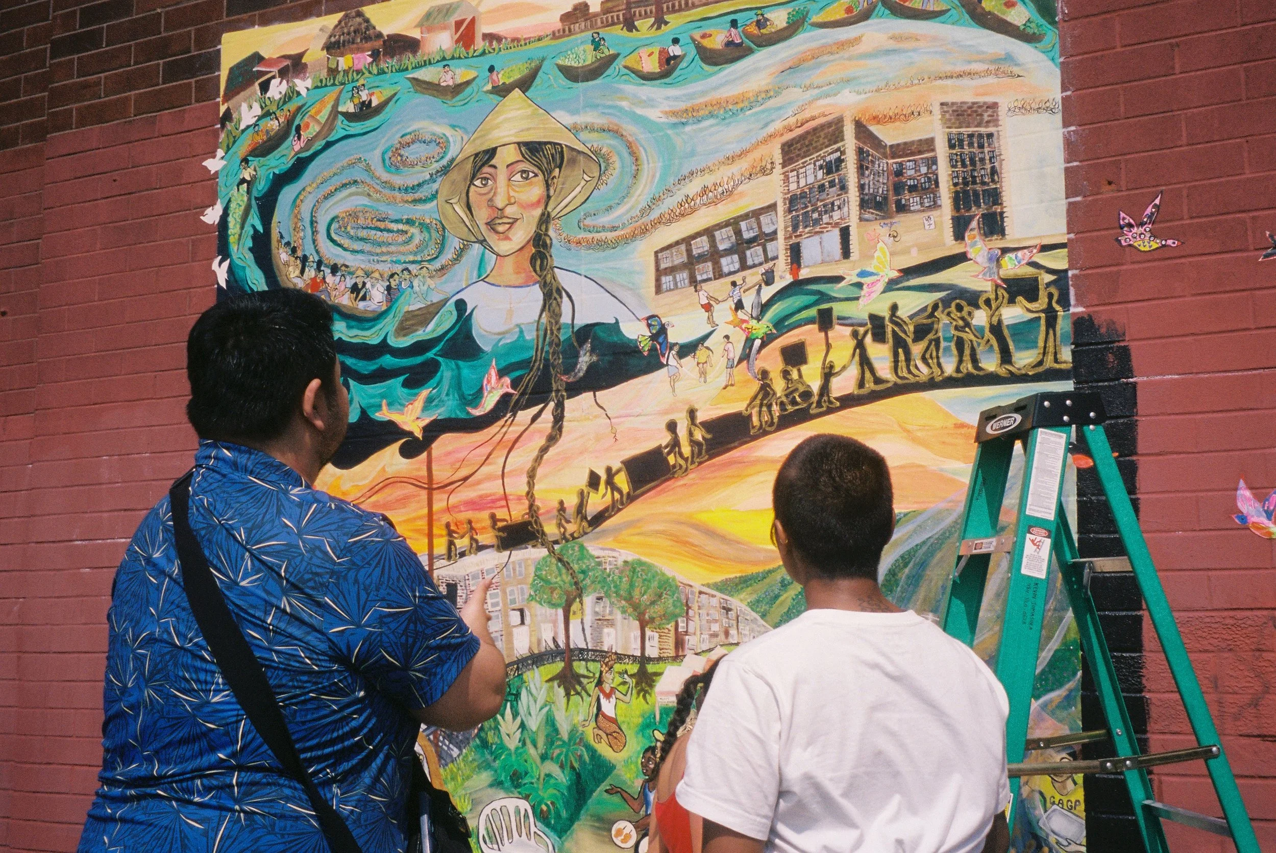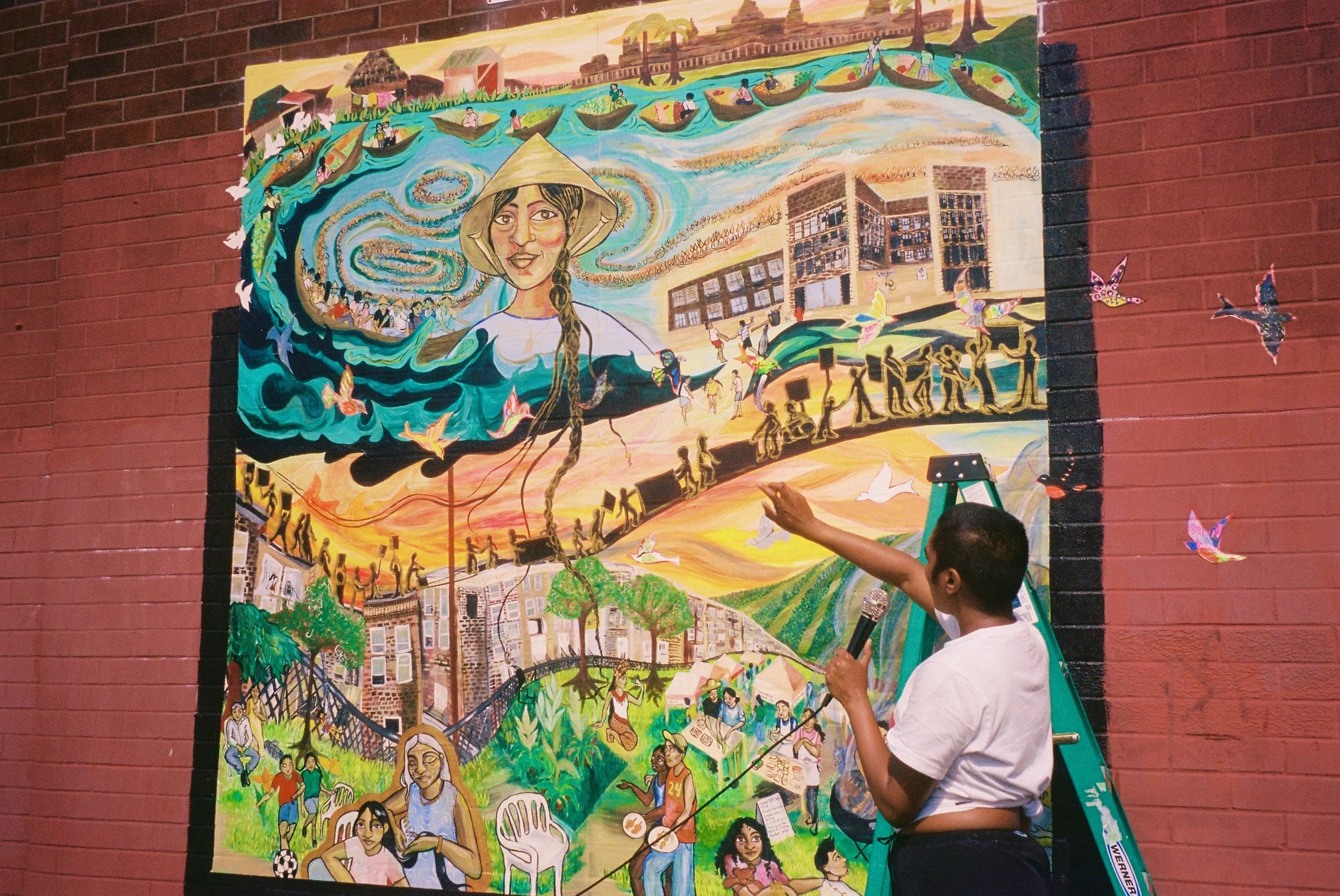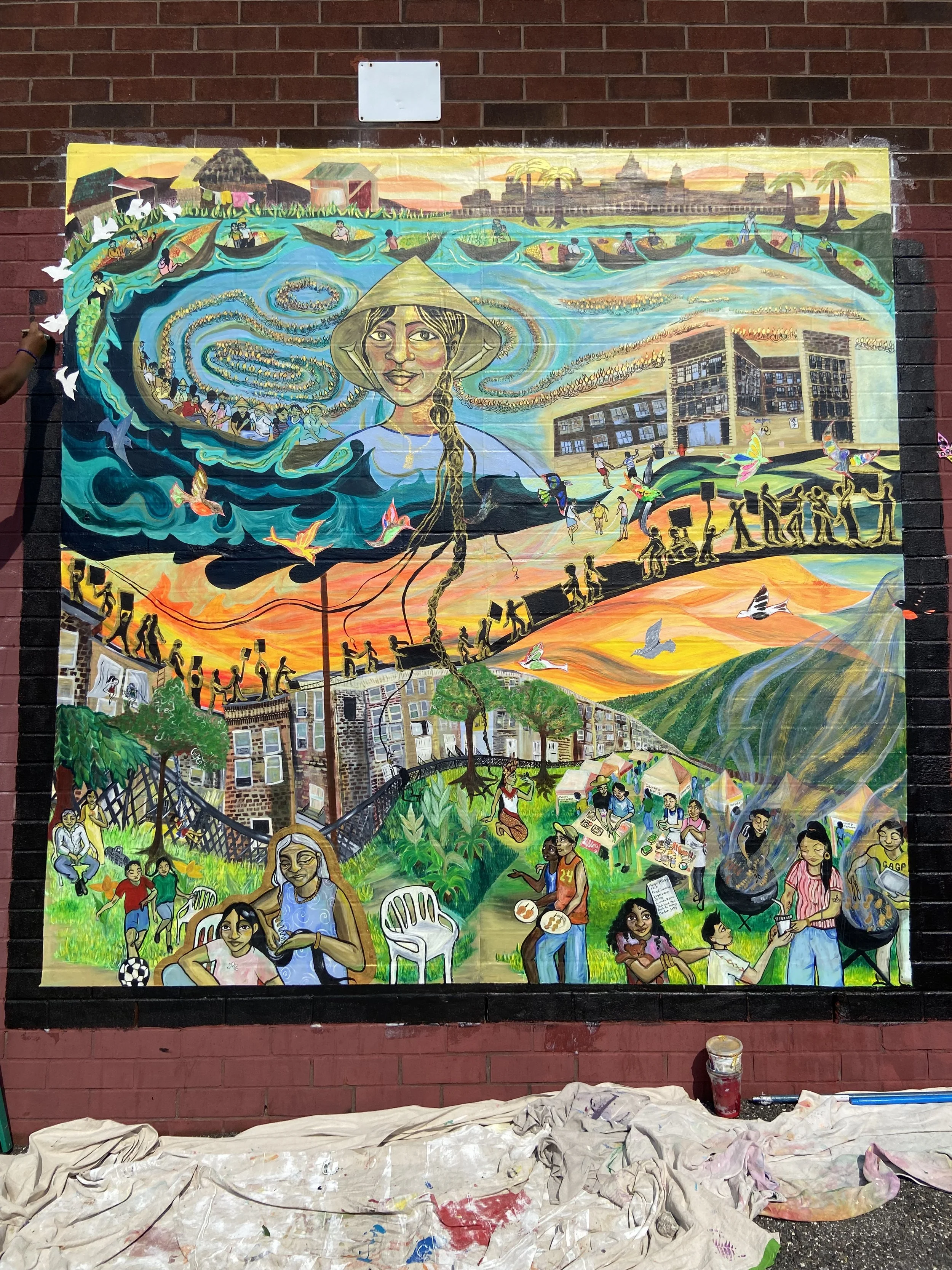 In Collaboration with the OST after school program of the Cambodian Association of Greater Philadelphia (CAGP), Fleisher Art Memorial, and Marigold Murals, Kate Welbes worked with students at CAGP to create TITLE. Paying tribute to the thousands of SouthEast Asian refugees who were displaced and brought to Philadelphia, we have created TITLE, a mural holding the symbols and stories of community care, collective resistance, rage, grief, joy, and resilience of the SouthEast Asian community living in Philly.