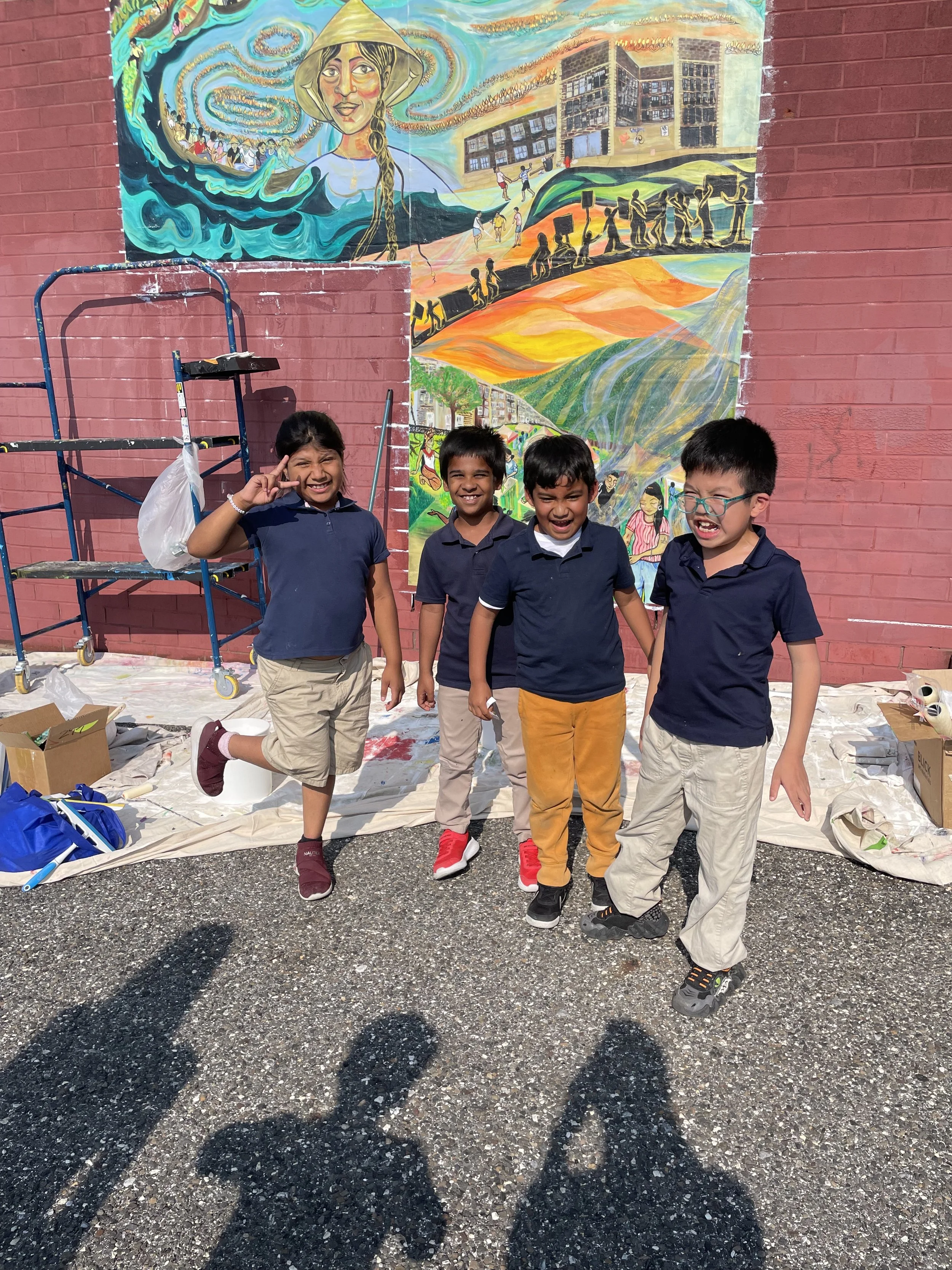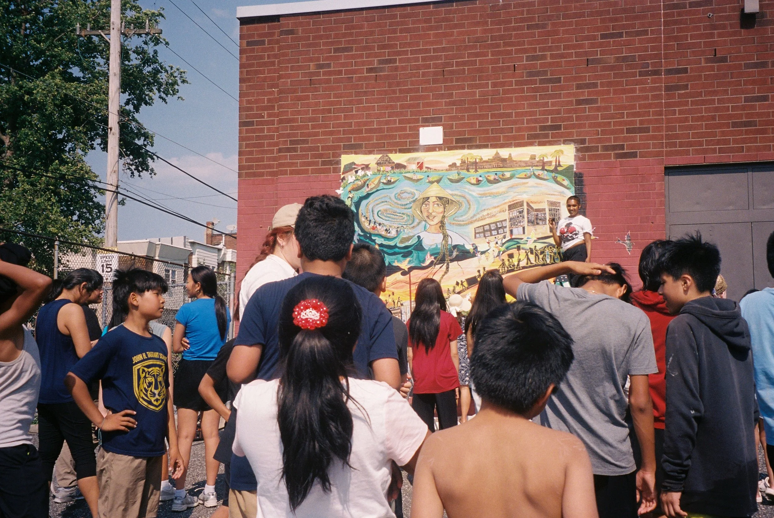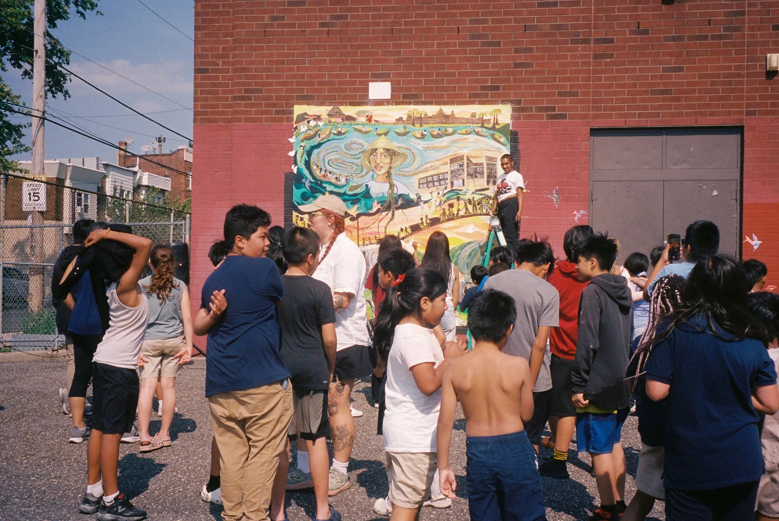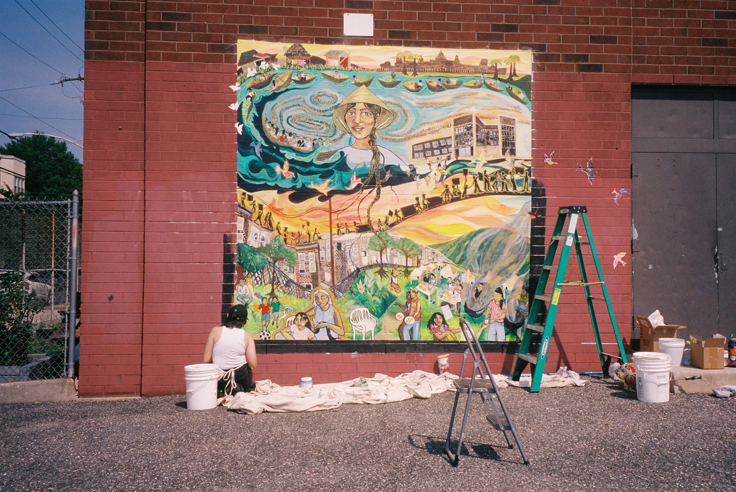 In Collaboration with the OST after school program of the Cambodian Association of Greater Philadelphia (CAGP), Fleisher Art Memorial, and Marigold Murals, Kate Welbes worked with students at CAGP to create TITLE. Paying tribute to the thousands of SouthEast Asian refugees who were displaced and brought to Philadelphia, we have created TITLE, a mural holding the symbols and stories of community care, collective resistance, rage, grief, joy, and resilience of the SouthEast Asian community living in Philly.